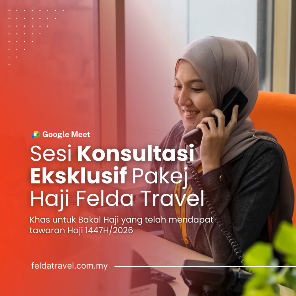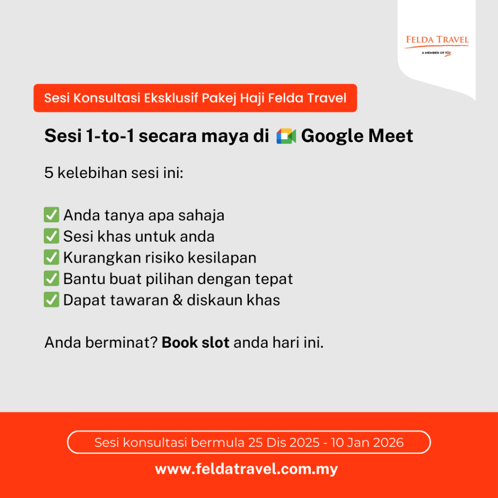 Sesi Konsultasi Google Meet 1-to-1 Khas untuk anda yang telah mendapat tawaran Haji 2026, jom sertai sesi konsultasi di Google Meet secara PERCUMA. Pilih tarikh & masa yang sesuai, anda akan terima sesi 1-to-1 bersama kami. Lengkapkan borang di bawah untuk temujanji di Google Meet. Sesi Konsultasi 1-to-1Nama PenuhNo TelefonEmailStatus Anda? Telah dapat tawaran haji 2026 RayuanPilih Tarikh Sesi Penerangan 30 Dis 2025 31 Dis 2025 01 Jan 2026 02 Jan 2026 03 Jan 2026 04 Jan 2026 05 Jan 2026 06 Jan 2026 07 Jan 2026 08 Jan 2026 09 Jan 2026 10 Jan 2026Pilih Masa Sesi Penerangan 11:00 AM 03:00 PM 05:30 PM 08:45 PMMaaf. Sesi penerangan Google Meet hanya untuk jemaah haji yang telah mendapat tawaran haji 2026 sahaja.Hantar Borang